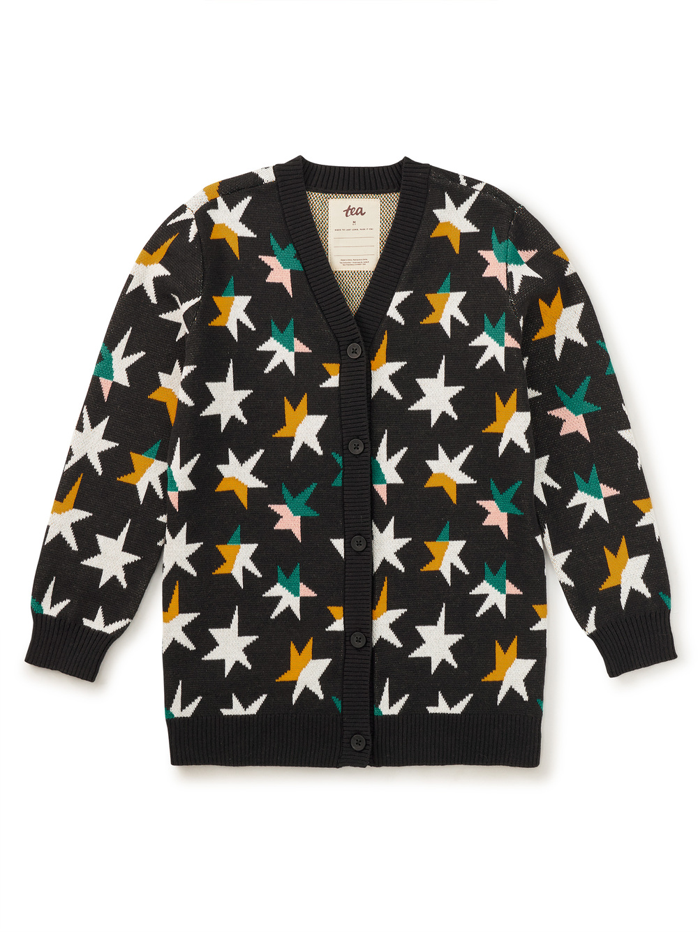 Bring all the star power with this cozy knit layer, infused with the bold, expressive spirit of South Korean pop culture. Inspired by the vibrant colors and dynamic style seen in K-pop fashion, this longline cardigan features an allover multicolor star pattern that truly shines. Made from 100% combed cotton for cloud-soft comfort, it's the perfect layer for cooler days. The classic V-neck and longer length make it a stylish match for dresses, leggings, and beyond. Thoughtful details--like easy button closures and a spare button just in case--make this a favorite go-to. Finished with a built-in name tag to keep it close at school or ready to pass down.