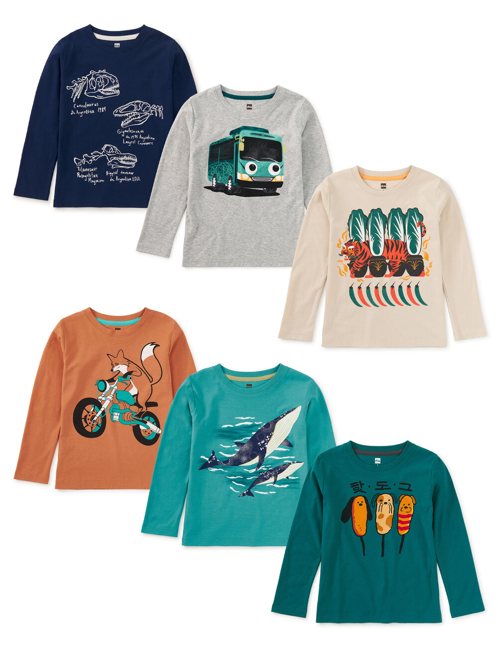 From dinosaurs to street food, buses to big blue whales, this set of long sleeve tees brings the whole world to their closet. Each hand-illustrated design sparks curiosity and imagination while being crafted from 100% soft cotton jersey that stands up to countless washes. Includes interior neck tape for lasting quality. Above thigh length. Perfect for school days, playdates, and everything in between, these tees are everyday essentials with a globally inspired twist.