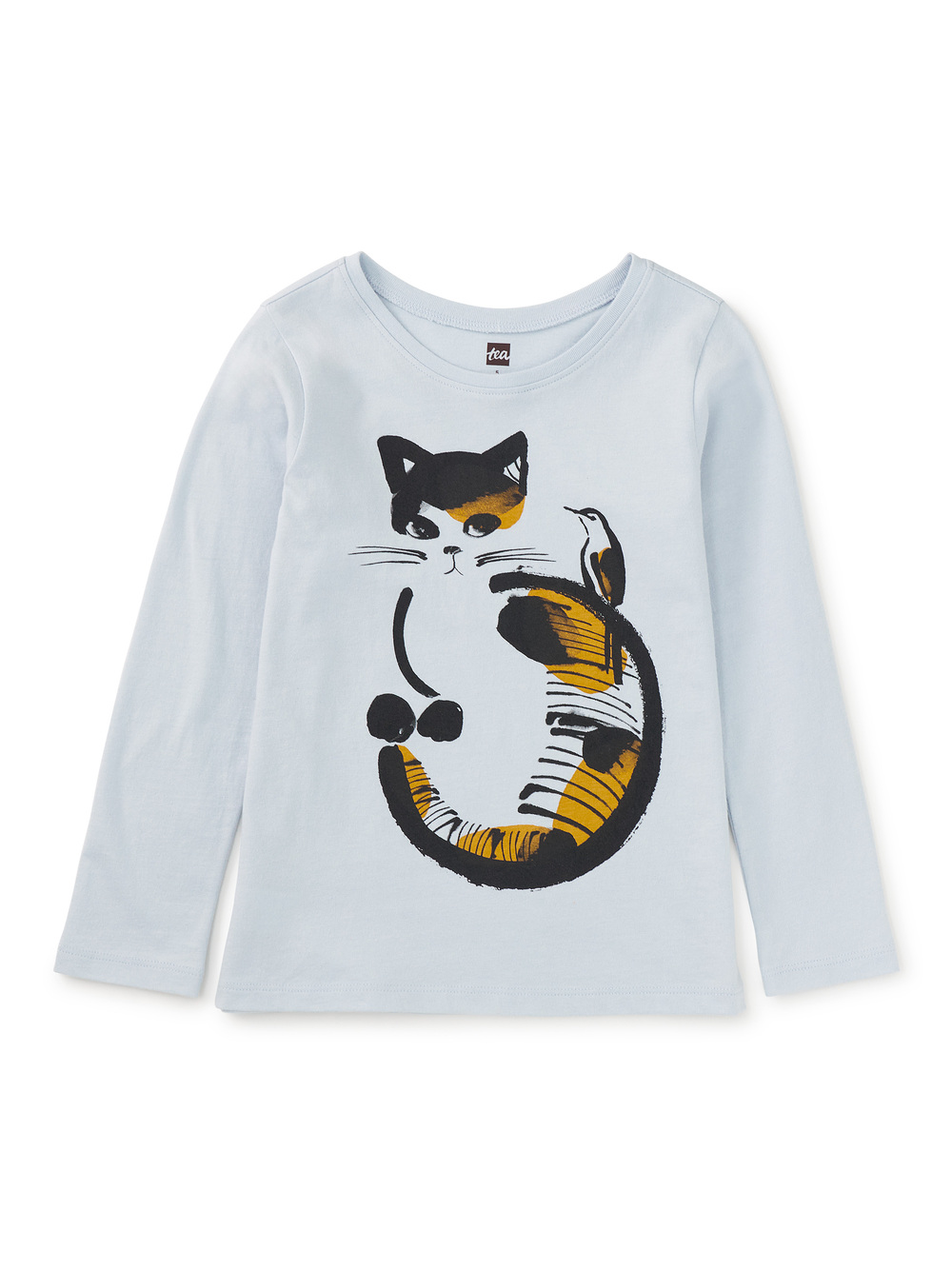 Inspired by the fluid brushstrokes of traditional Korean ink wash painting, this playful kitty design captures the artistry and charm of South Korea's creative heritage. Crafted from 100% soft cotton, this long sleeve tee is perfect for layering and pairs easily with our stretchy velour flare pants, twirly skirts, or comfy joggers for an effortless winter look.