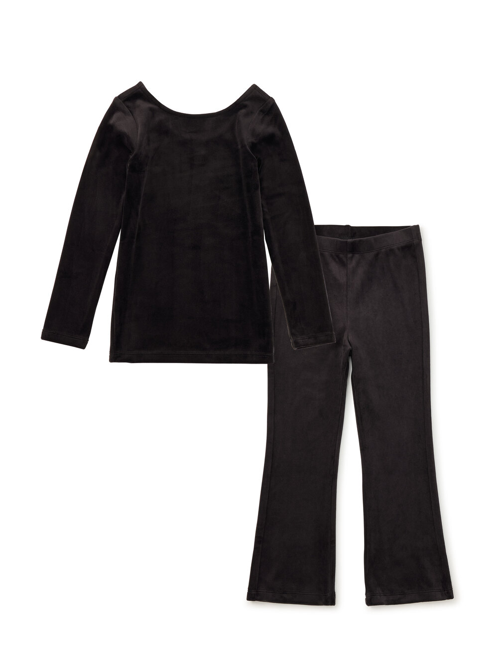Soft, sleek, and a little bit luxe--this velour set brings everyday comfort with a dress-up feel. The slim-fit top pairs perfectly with the retro-inspired flare pants for a polished head-to-toe look that's ready for school days, holiday parties, or anything in between. Stretchy, cozy, and endlessly versatile, it's a set that feels as good as it looks.
