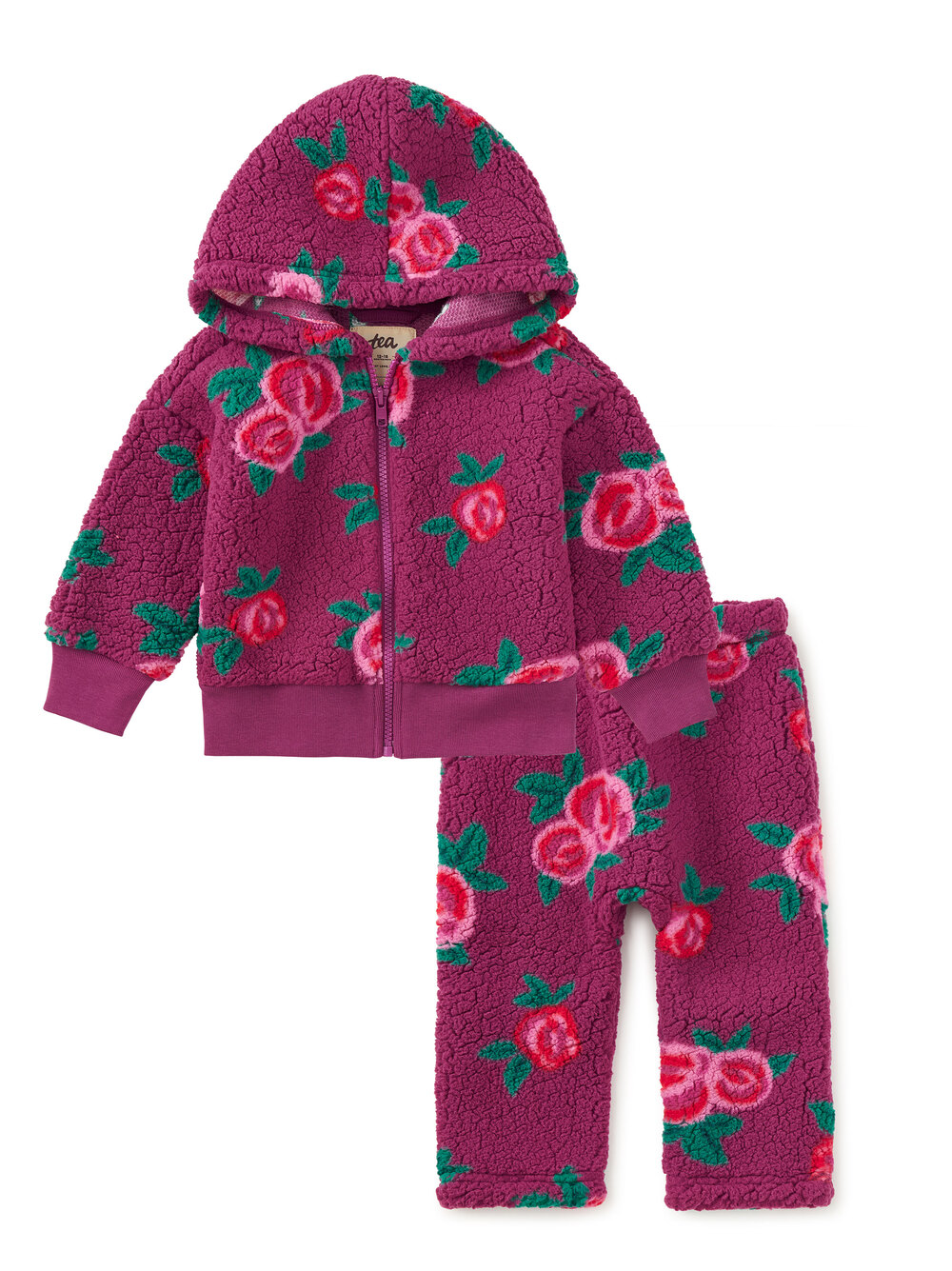 A perfect pick for new and expecting parents, this cozy teddy fleece set is designed to delight both baby and gift-giver alike. Incredibly soft and snug, it keeps little ones warm from head to toe with plush fleece and a sweet floral print. The hoodie features an easy zip closure for quick changes, and the matching pants have a comfy elastic waist for growing babes. A beautiful, practical gift that’s sure to be loved from day one.