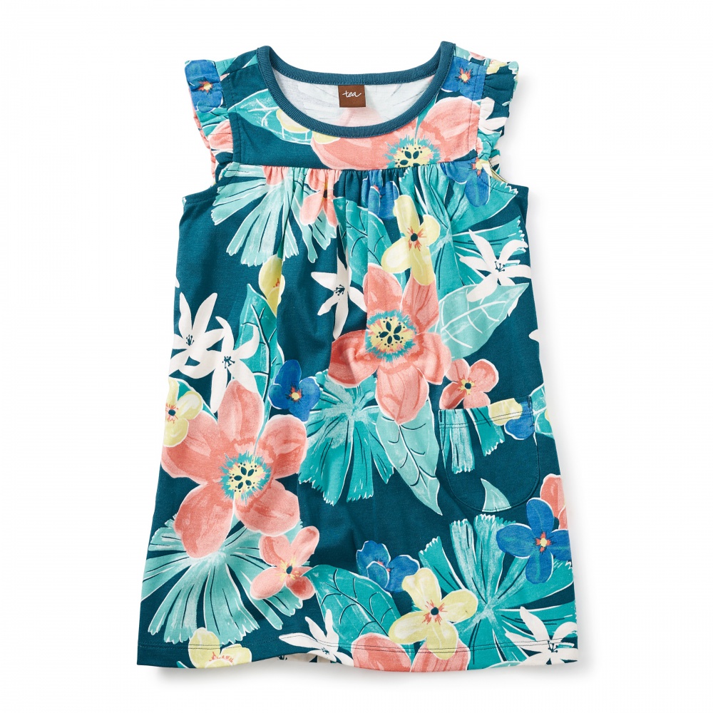 This dress is so adorable, as are all of the Tea clothes. However, they are also very small - my almost 3 year old daughter fits in the size 6 and 7 dresses and shirts comfortably, and she is not large for her size. My three sons also all require 2-3 sizes up to be a comparable fit in Tea as opposed to other clothes. Just something to note that when buying you will probably have to size up, but once you know this, they are the cutest clothes!